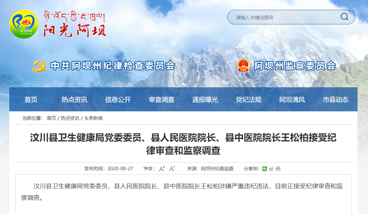 - 汶川县卫生健康局党委委员、县人民医院院长、县中医院院长王松柏接受纪律审查和监察调查