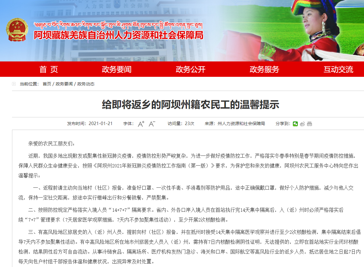 四川新闻网消息(记者 陈荞)1月21日,阿坝州人力资源和社会保障局发布《给即将返乡的阿坝州籍农民工的温馨提示》(以下简称《提示》),提出要按照防控规定严格落实入境人员“14+7+7”隔离要求。《提示》指出,省内、外各口岸入境人员在首站执行完14天集中隔离后,入(返)州时必须严格落实后续“7+7”管理要求(7天居家医学观察措施,7天内不参加聚集性活动),至少开展2次核酸检测。