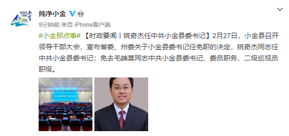 2月27日,小金县召开领导干部大会,宣布省委、州委关于小金县委书记任免职的决定,姚奇杰同志任中共小金县委书记;免去毛端喜同志中共小金县委书记、委员职务,二级巡视员职级。
