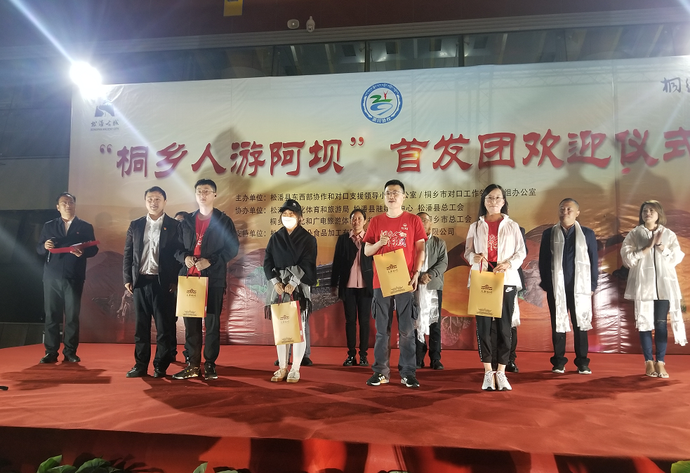 桐乡市总工会法律与权益保障部部长王鲁向松潘县授予了“桐乡市职工疗休养合作基地”铜牌。桐乡市发改局副局长马红权代表对口办向4家商户颁发《农产品消费协作定点采购单位》铜牌。同时,为了感谢桐乡市民对松潘发展的支持,松潘县为首发团成员准备了一份感恩大礼包,内容包含松潘土特产礼包一份,4家指定商户购物减满券,行程增值服务,宾馆升级、增加菜品,花湖、黄龙等高海拔景区全程医护服务等。