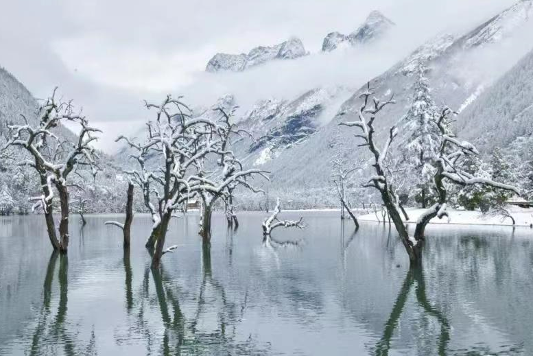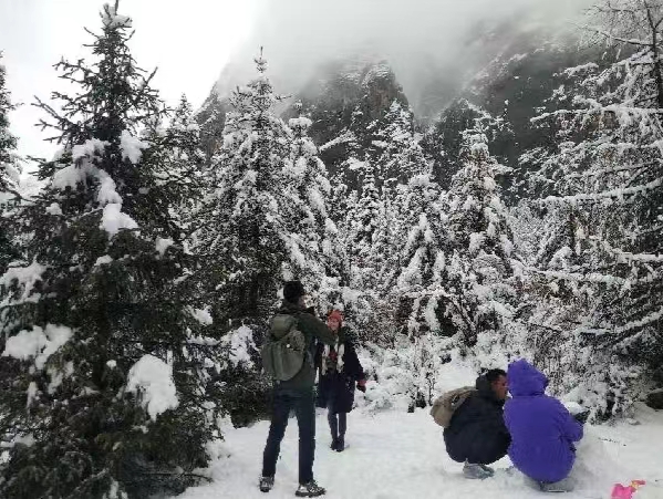在四姑娘山双桥沟景区,游客们三五成群结伴而行,他们有的漫步在景区栈道上,听雪落下的声音,有的堆雪人、打雪仗,在玩雪的同时还不忘驻足拍照留念。