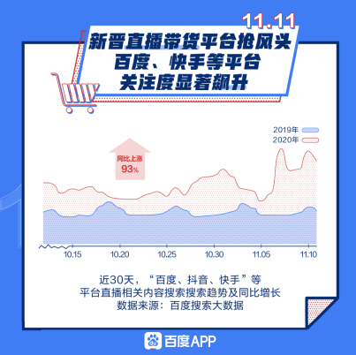 以抖音、快手为代表的短视频内容平台开始了直播带货的尝试,而百度重点布局知识直播,上线“购物频道”,构建从搜索、信息到商品的闭环。现如今,直播已经成电商营销标配,且迎来二次爆发。百度搜索大数据指出,近30天,“百度、抖音、快手”等平台直播相关内容搜索热度同比增长93%,而头部主播“李佳琦、薇娅、辛巴”的相关搜索热度同比增长106%。