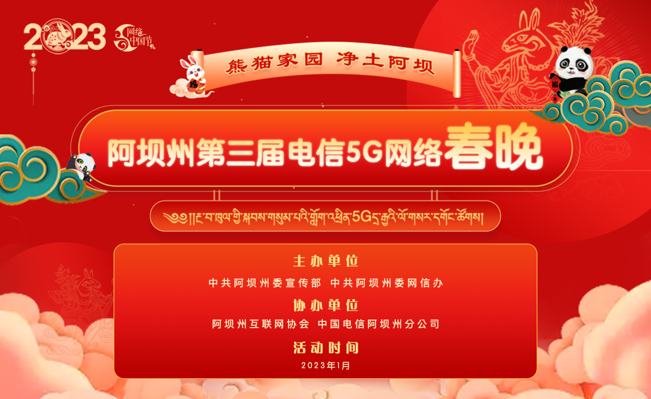 “熊猫家园 净土阿坝”网络春晚已连续举办三届,本届网络春晚由中共阿坝州委宣传部、中共阿坝州委网信办主办,中国电信阿坝州分公司、阿坝州互联网协会协办。