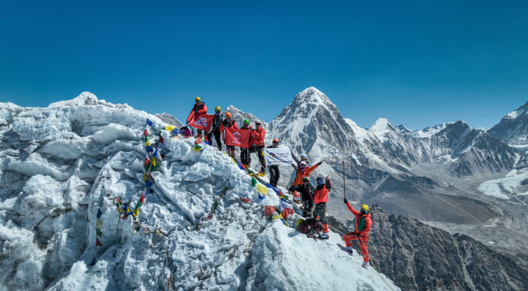 这支队伍由7名来自国内优秀攀登者组成,队伍从4月8日开始集合进行攀登准备。4月12日,全体队员正式集结完毕,然后徒步前往珠峰南坡大本营,正式开启攀登行程。此次攀登的3名高山向导均来自四川省阿坝州黑水县三奥雪山地区,由泽勇担任攀登队长,三基木、蒋杨担任高山向导兼任高山摄影师,其中泽勇和蒋杨都曾在2019年5月登顶珠峰。另四名攀登者,江丙财来自四川省德阳、苗勇来自陕西省西安、蒋珏来自重庆市、刘小彤来自北京市。