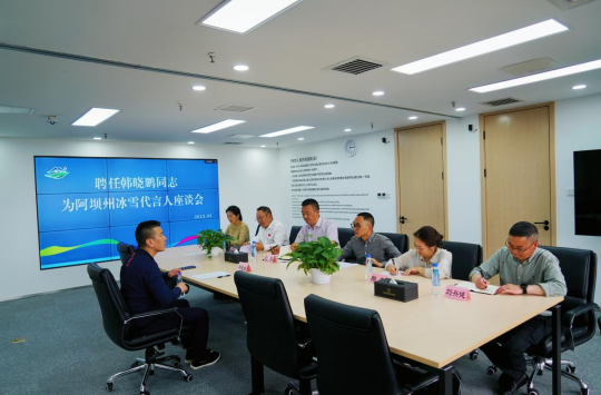 座谈会上,阿坝州文化体育和旅游局局长巴黎向韩晓鹏颁发了聘书与奖杯,韩晓鹏发表受聘感言;副局长陈垚吉向大家介绍了阿坝州冰雪资源和冰雪户外运动的开展情况。